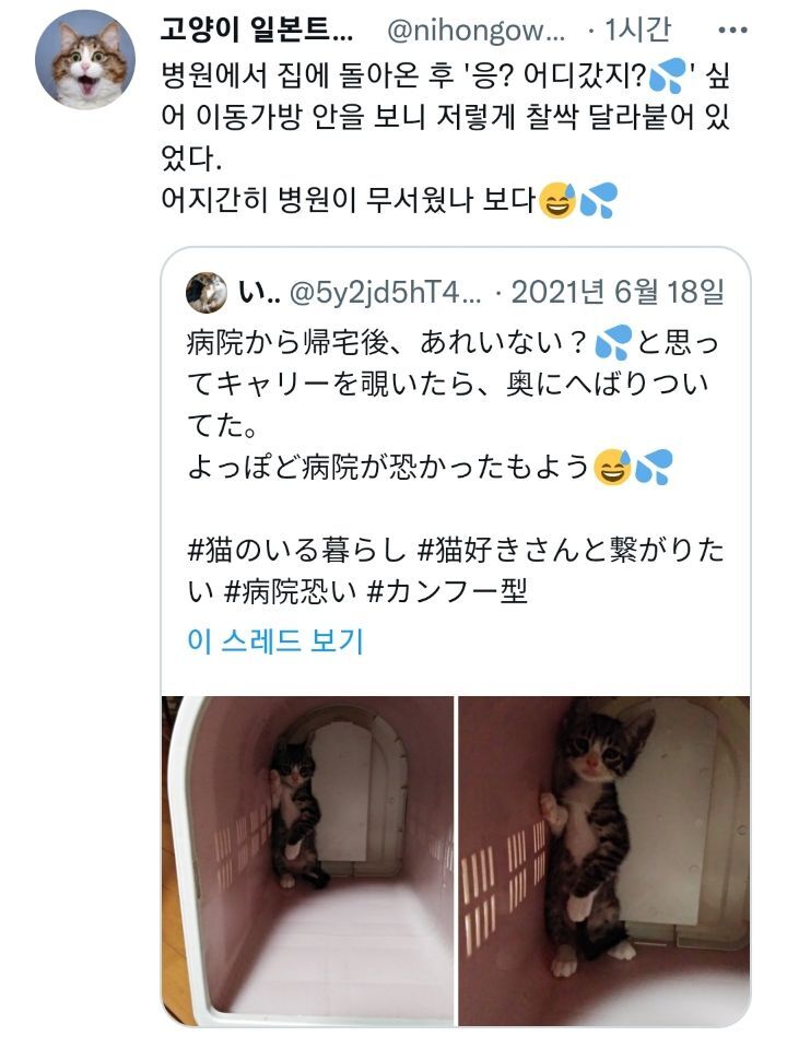 카테고리 없음 동물병원에 처음 다녀온 고양이 by 나좀데려가개_경북 2022. 4. 1. 무섭다냥 공유하기 게시글 관리 나좀데려가개_경북 저작자표시 비영리 동일조건 (새창열림) 댓글
