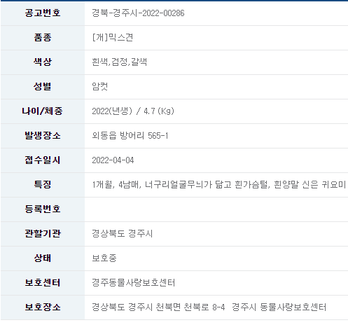 카테고리 없음 22/04/05_유기견 입양 소식_경주#6 by 나좀데려가개_경북 2022. 4. 4. 유기견 무료 분양 정보 공유드립니다. 분양 받고자 하시면 아래 링크를 참조해주세요. 유기견 입양 정보 바로가기 오늘도 새로운 가족을 기다리는 유기견들이 많이 있습니다. 보다 좋은 환경에서 좋은 가족을 만날 수 있도록 부탁드립니다. 공유하기 게시글 관리 나좀데려가개_경북 저작자표시 비영리 동일조건 (새창열림) 댓글