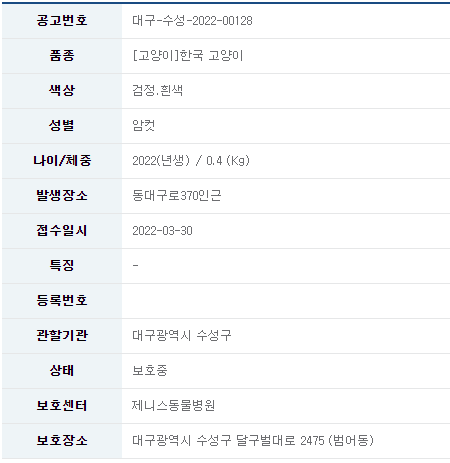 카테고리 없음 22/3/31_유기묘 입양 소식_대구 수성 by 나좀데려가개_경북 2022. 3. 30. 유기묘 무료 분양 정보 공유드립니다. 분양 받고자 하시면 아래 링크를 참조해주세요. 유기묘 입양 정보 바로가기 오늘도 새로운 가족을 기다리는 유기묘들이 많이 있습니다. 보다 좋은 환경에서 좋은 가족을 만날 수 있도록 부탁드립니다. 공유하기 게시글 관리 나좀데려가개_경북 저작자표시 비영리 동일조건 (새창열림) 댓글