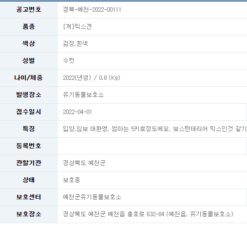 카테고리 없음 22/04/02_유기견 입양 소식_예천#1 by 나좀데려가개_경북 2022. 4. 1. 유기견 무료 분양 정보 공유드립니다. 분양 받고자 하시면 아래 링크를 참조해주세요. 유기견 입양 정보 바로가기 오늘도 새로운 가족을 기다리는 유기견들이 많이 있습니다. 보다 좋은 환경에서 좋은 가족을 만날 수 있도록 부탁드립니다. 공유하기 게시글 관리 나좀데려가개_경북 저작자표시 비영리 동일조건 (새창열림) 댓글